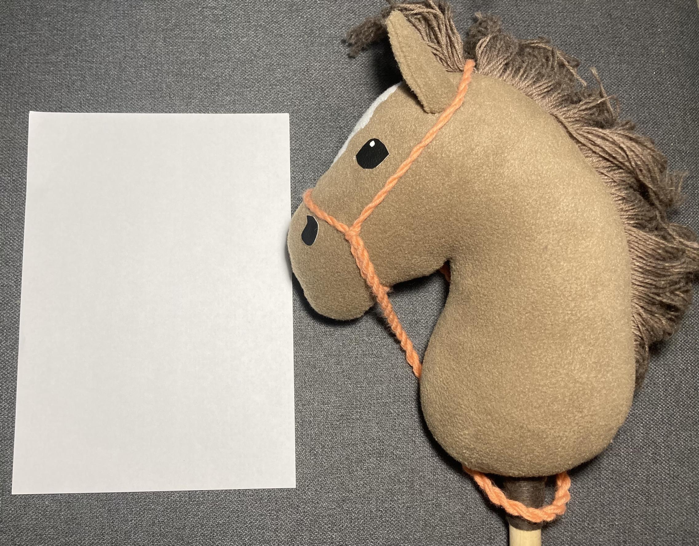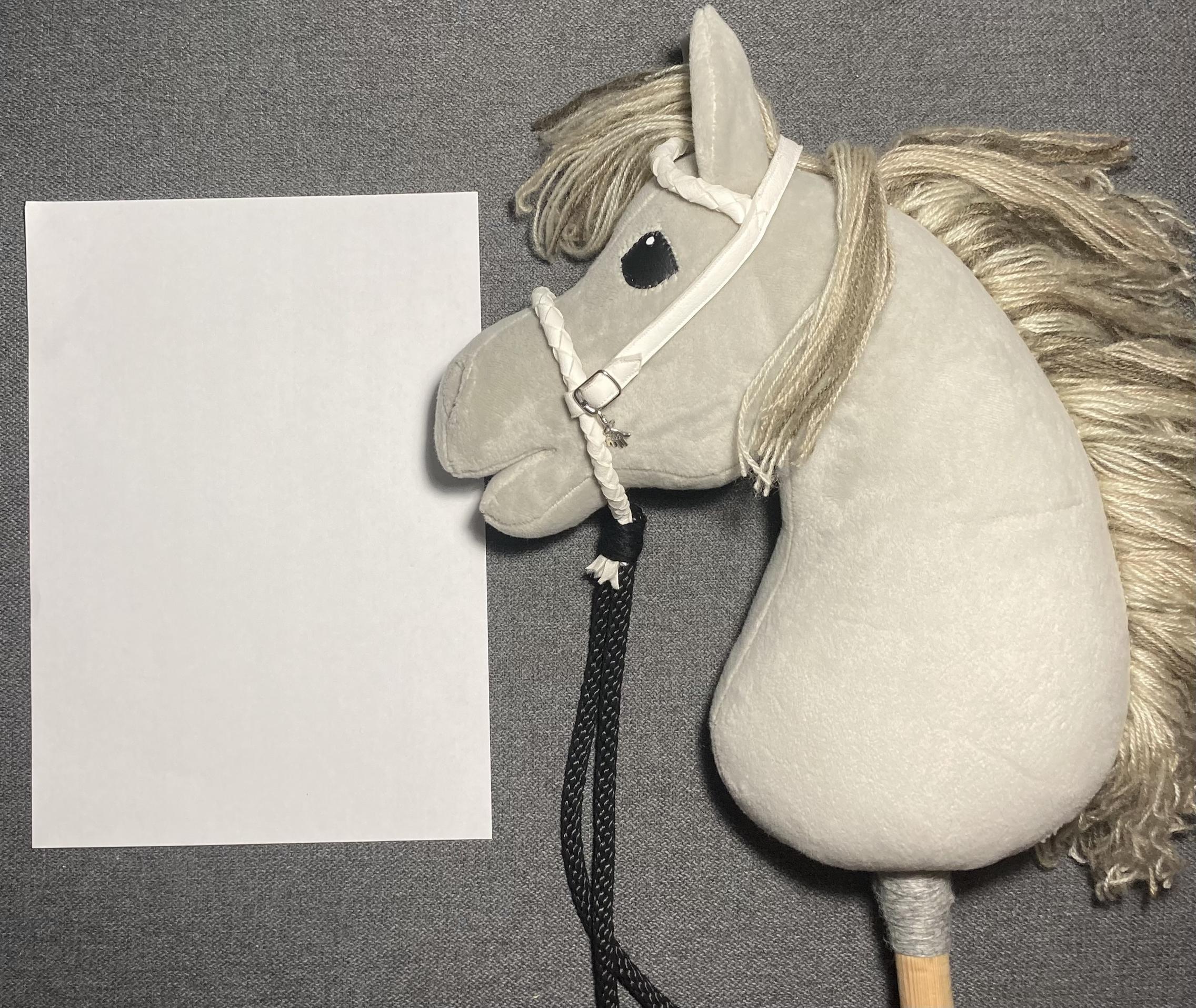 - Keppihevosen koko (A4 paperiin verrokkina) noin: leveys 27 cm x korkeus 35 cm + keppi n. 55 cm. Keppihevoset ovat tukikankaalla tuetusta velboasta valmistettuja ja niillä on suu. Korvissa on foamia tukemassa. Kuvissa näkyvät varusteet, kuten suitset tulevat keppihevosen mukana.