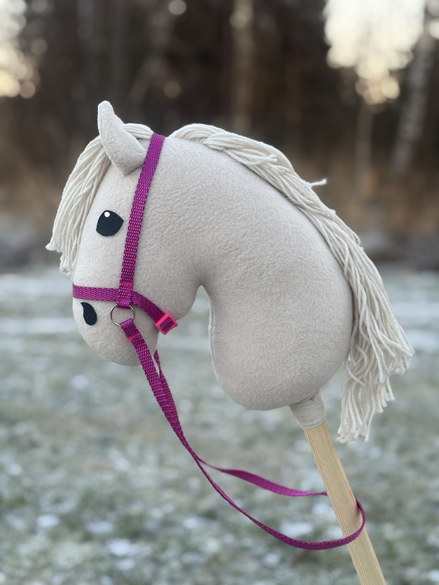 Näitä on vain yksi kappale. Fleecestä valmistettu keppiponi narusuitsilla. Korvat kiinnitetty ompelemalla, silmät ja sieraimet kuumaliimalla. Kuvassa näkyvät nylonsuitset tulevat keppihevosen mukaan.