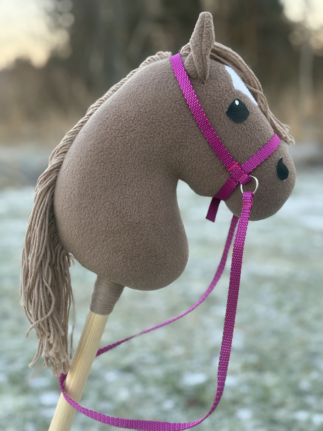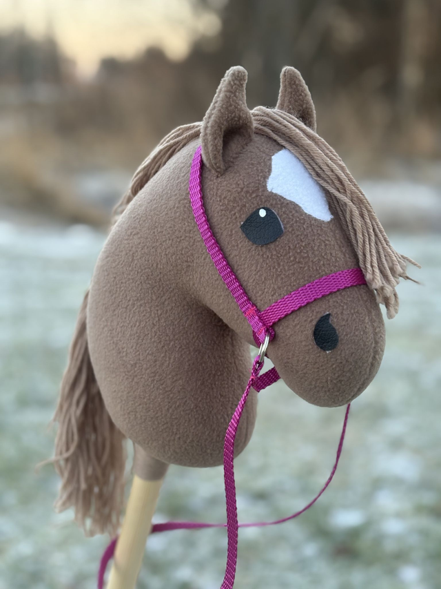Näitä on vain yksi kappale. Fleecestä valmistettu keppiponi narusuitsilla. Korvat kiinnitetty ompelemalla, silmät ja sieraimet kuumaliimalla. Kuvassa näkyvät nylonsuitset tulevat keppihevosen mukaan.