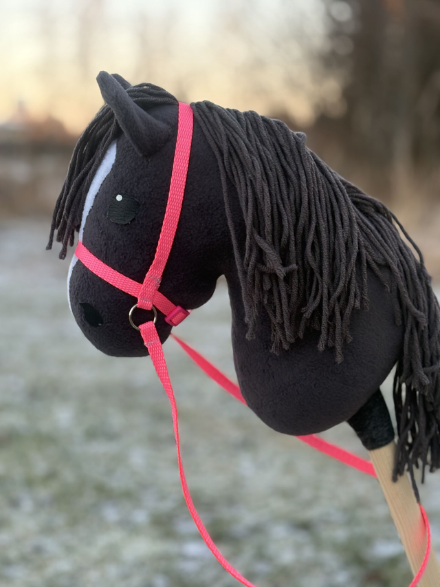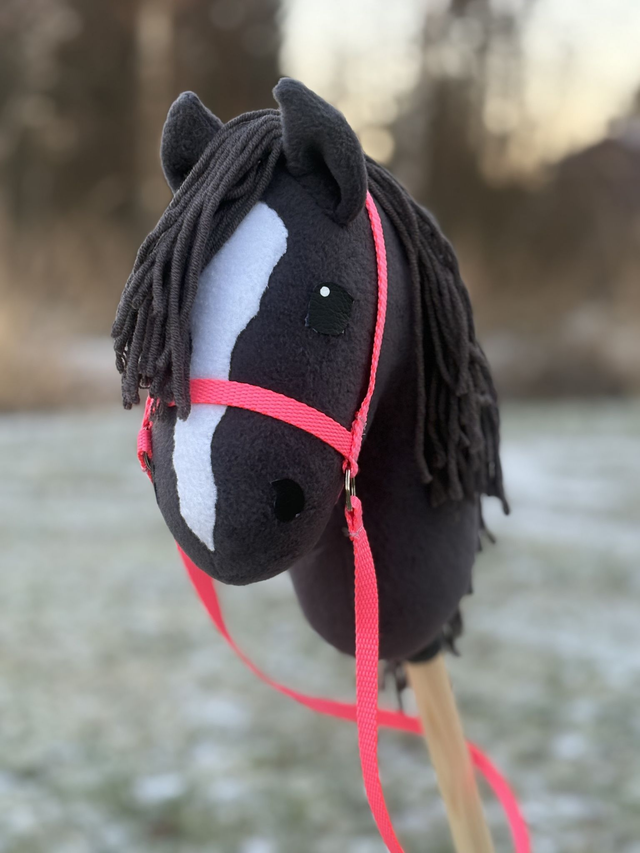 Näitä on vain yksi kappale. Fleecestä valmistettu keppiponi narusuitsilla. Korvat kiinnitetty ompelemalla, silmät ja sieraimet kuumaliimalla. Kuvassa näkyvät nylonsuitset tulevat keppihevosen mukaan.